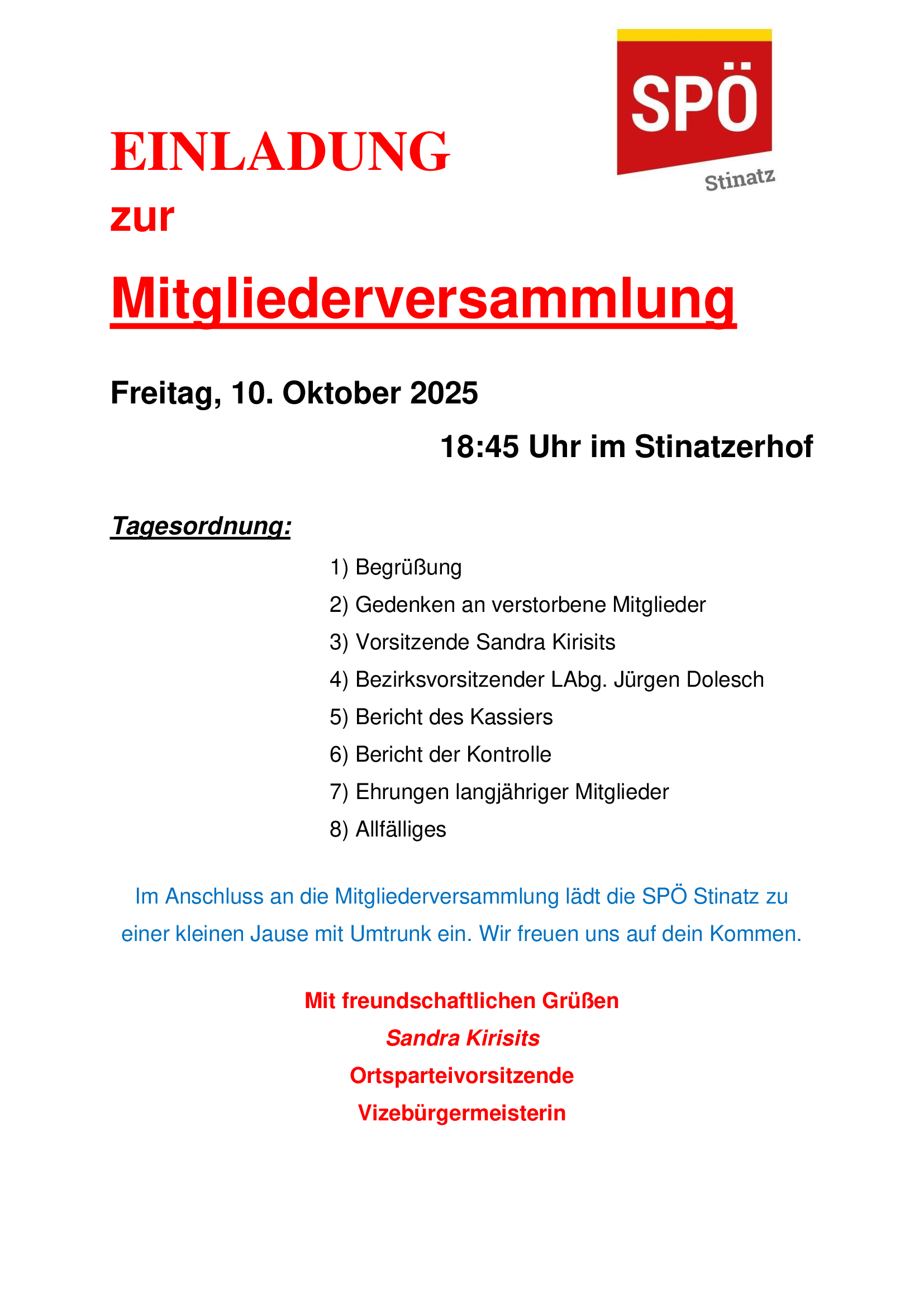 ​Am Freitag, 10. Oktober 2025 findet um 18:45 Uhr im Stinatzerhof die Mitgliederversammlung der SPÖ Stinatz statt. Wir laden alle Mitglieder recht herzlich ein und freuen sich auf viele Teilnehmer.
