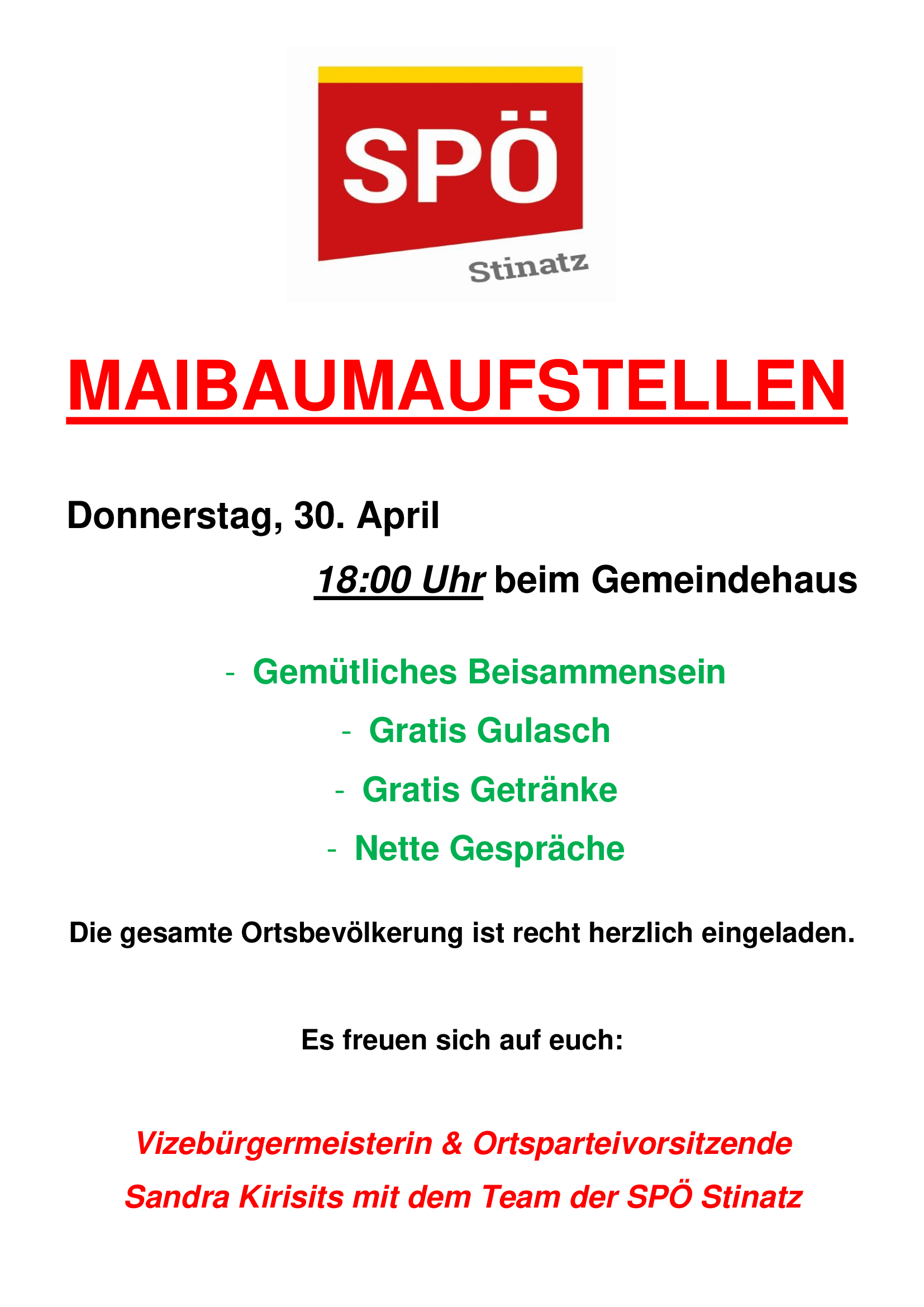 ​Am 30. April um 18:00 Uhr findet beim Gemeindehaus das Maibaumaufstellen der SPÖ Stinatz statt. Wir freuen uns auf ein gemütliches Beisammensein mit dir. Für das leibliche Wohl wird bestens gesorgt.